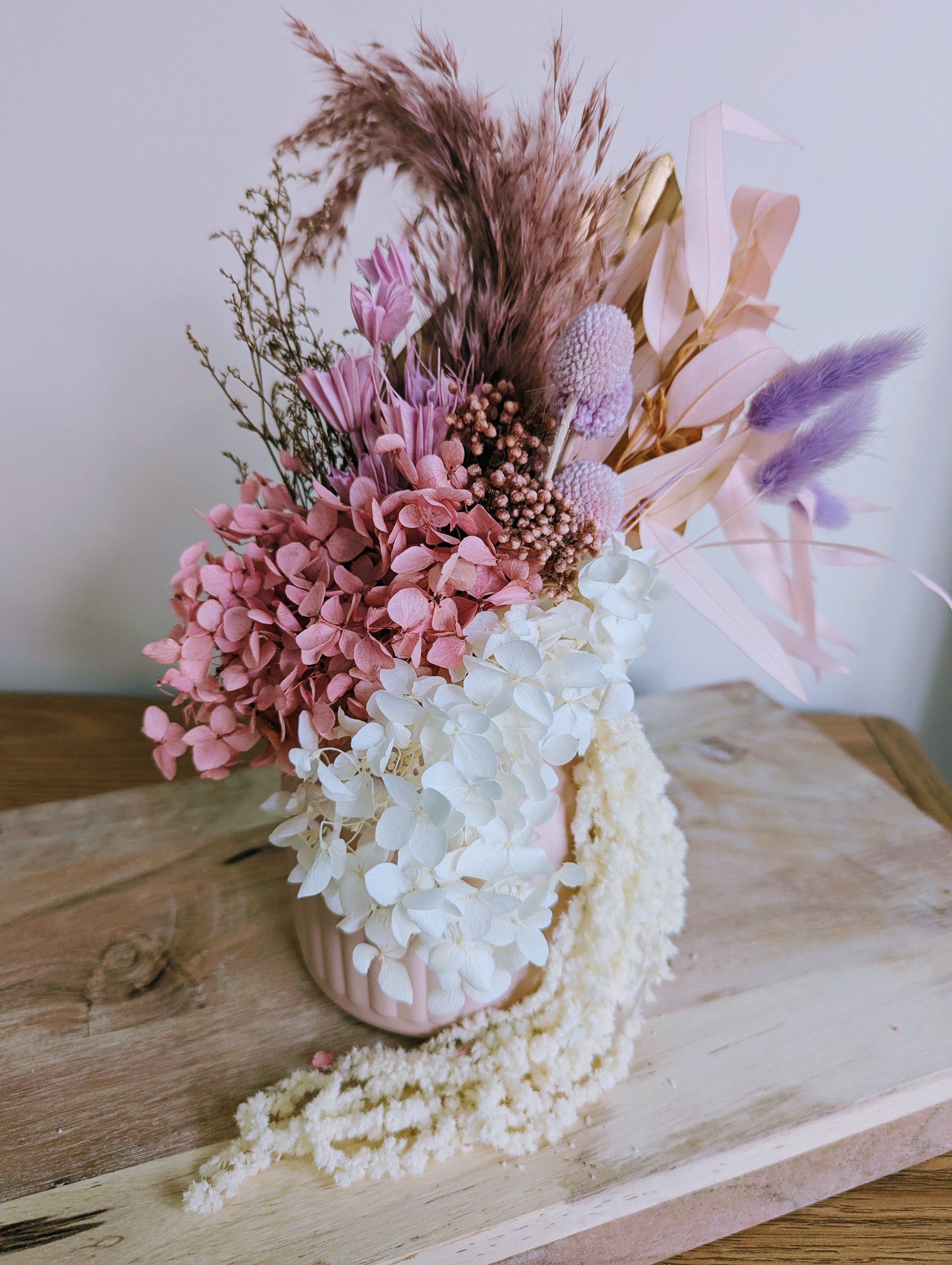 Elevate your living space or create a beautiful lasting memory for a loved one with this one of a kind preserved floral arrangement. Featuring a warm toned colour palette and a beautiful selection of pink and purple preserved flowers such as hydrangea, bunny tails and amaranthus, arranged into a small sized ceramic vase, hand sprayed using acrylic paint and sealed.