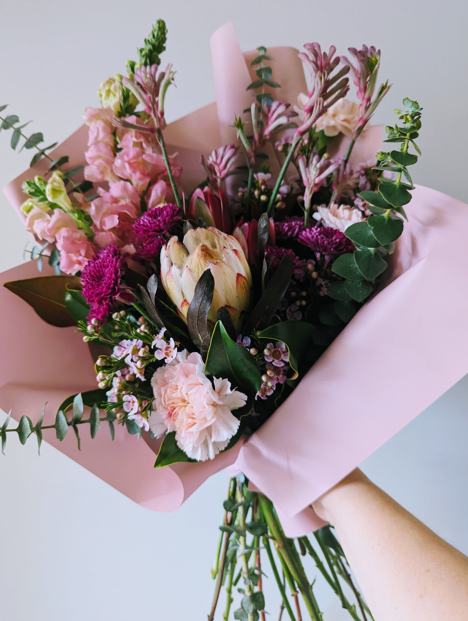 Make someone's day with this dreamy bouquet full of soft pink and blush florals with an extra special pop of natives. Featuring high quality seasonal flowers, including Snap Dragons, Protea, Kangaroo Paw and Wax Flower, all thoughtfully arranged into a showstopping bouquet. Finished with complimenting deco paper and ribbon. Available in 4 sizes- Mini, Small, Medium and Large. Please note that this bouquet is pre- designed and available in limited supply. Please note that this bouquet contains Kangaroo Paw which can cause itchiness in some people with sensitive skin.