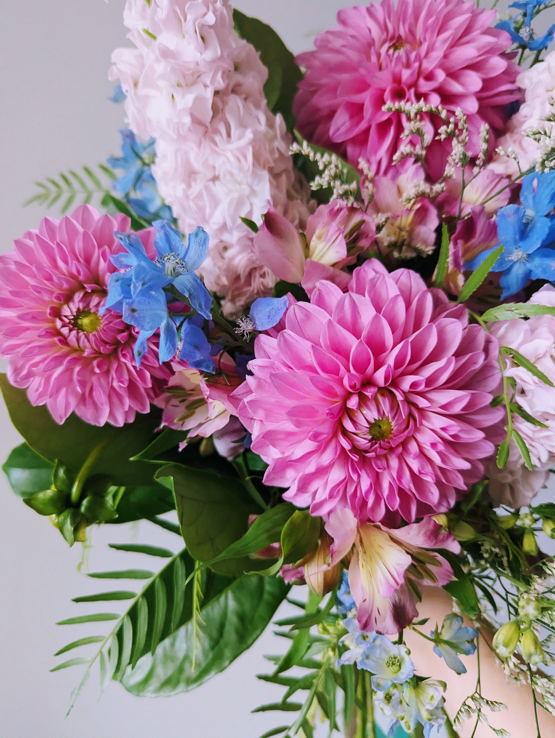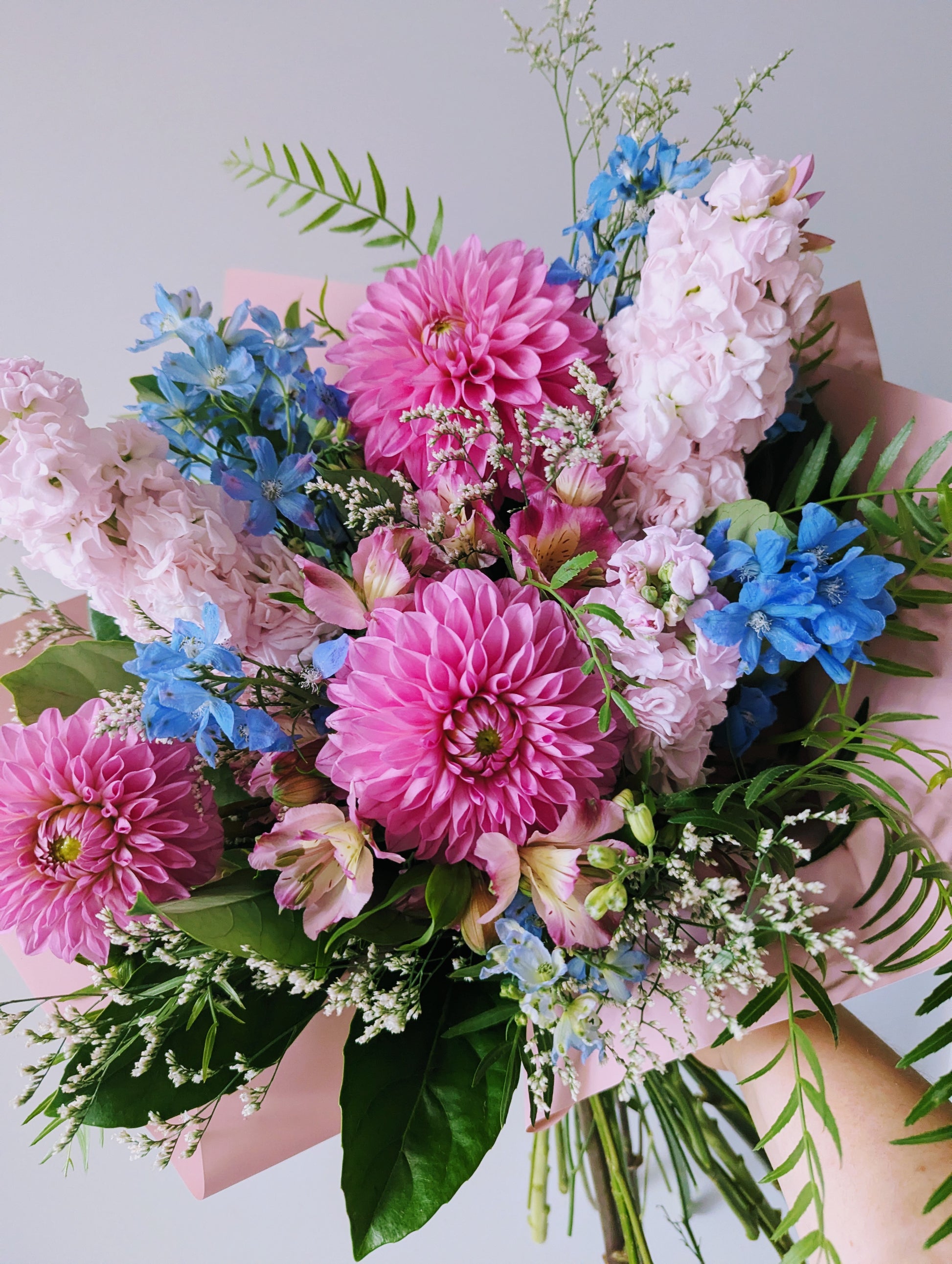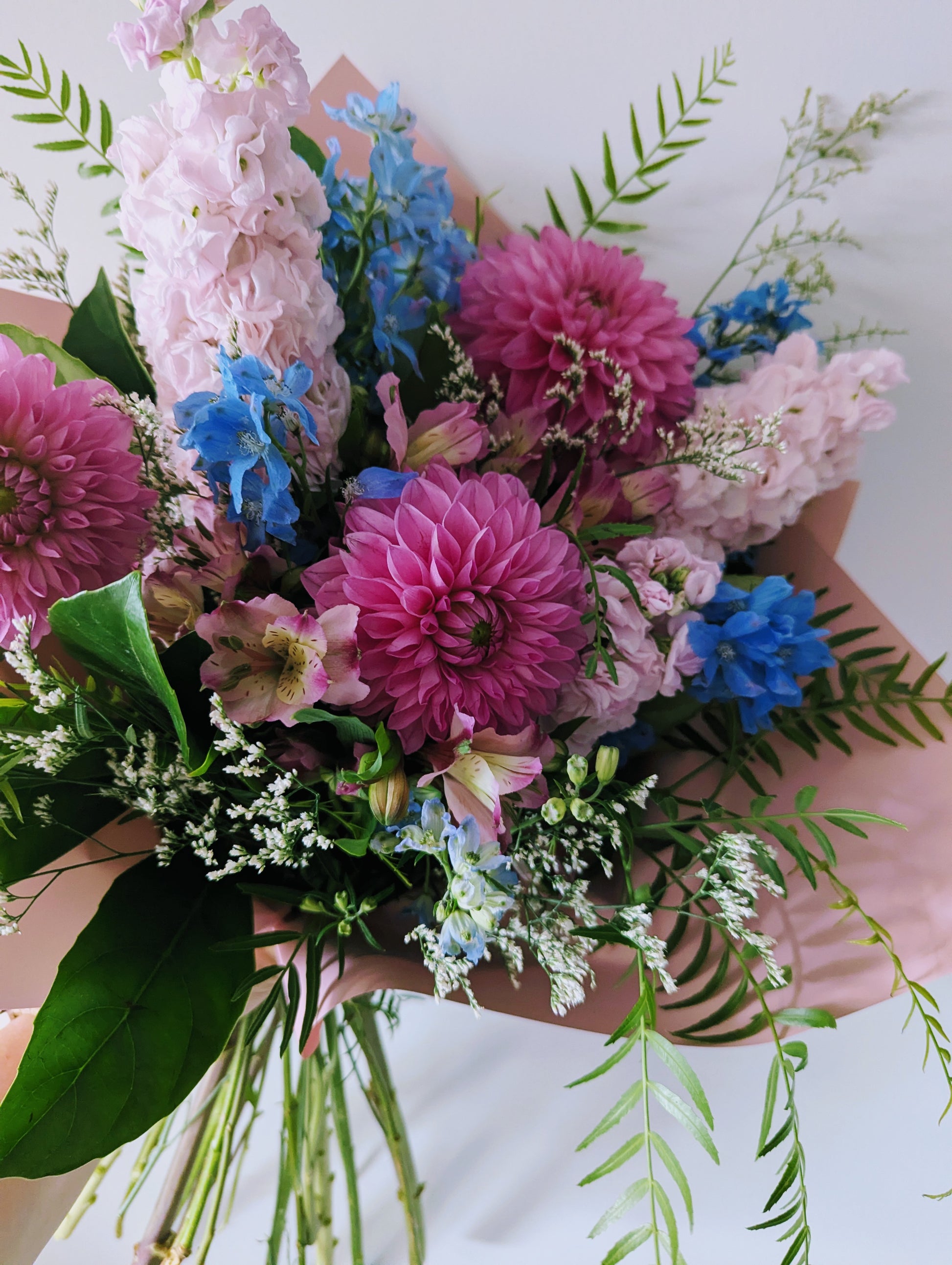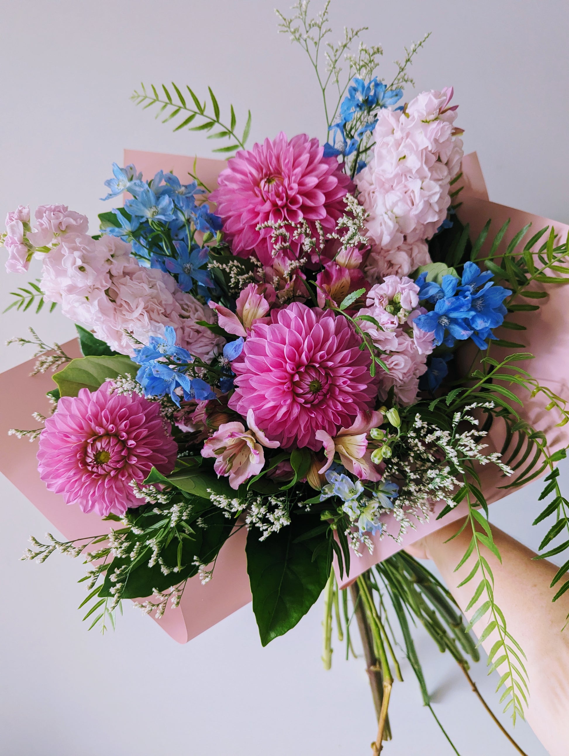 Make someone's day with this dreamy bouquet full of bright pink and blue toned flowers. Featuring high quality seasonal flowers which may include Stock, Dahlia's, Delphinium and Pepper Berry, all thoughtfully arranged into a showstopping bouquet. Finished with complimenting deco paper and ribbon. Available in 4 sizes- Mini, Small, Medium and Large.