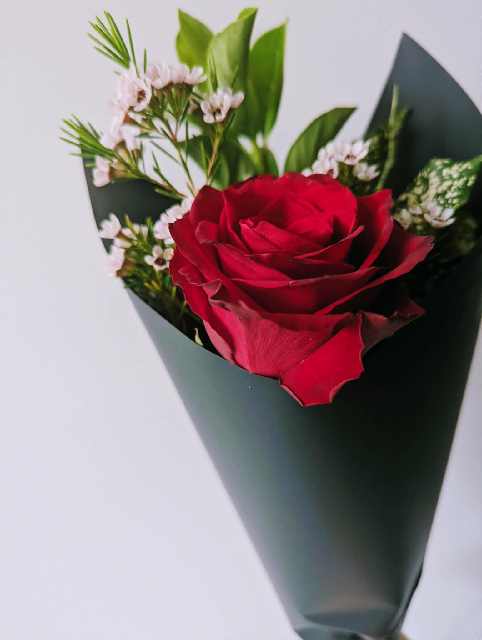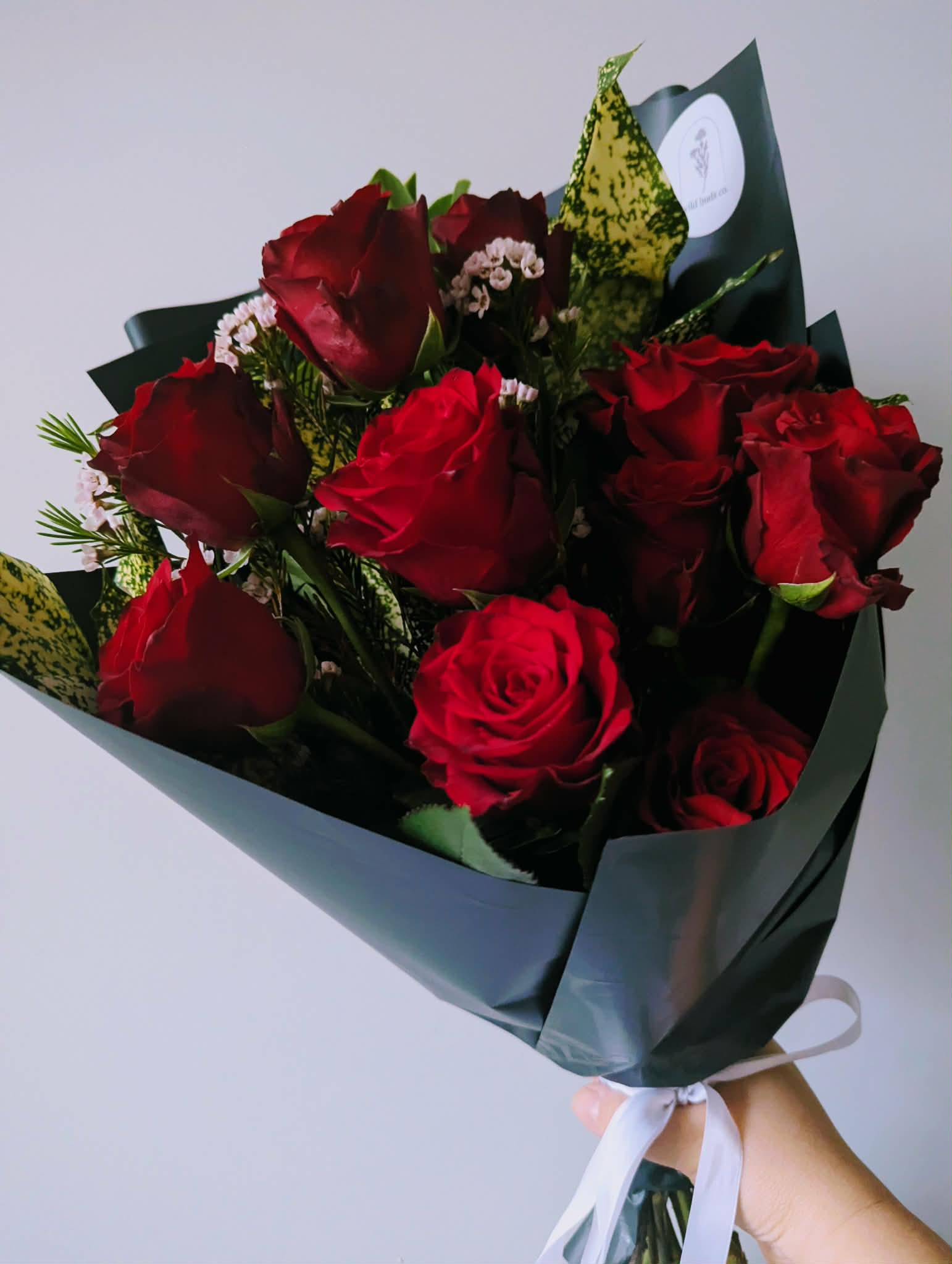 Send love this Valentine's Day with a stunning collection of mixed red roses. Thoughtfully arranged into a showstopping bouquet with filler and foliage and finished with complimenting deco paper and ribbon. Available in four size options- single, half a dozen, a dozen and two dozen.